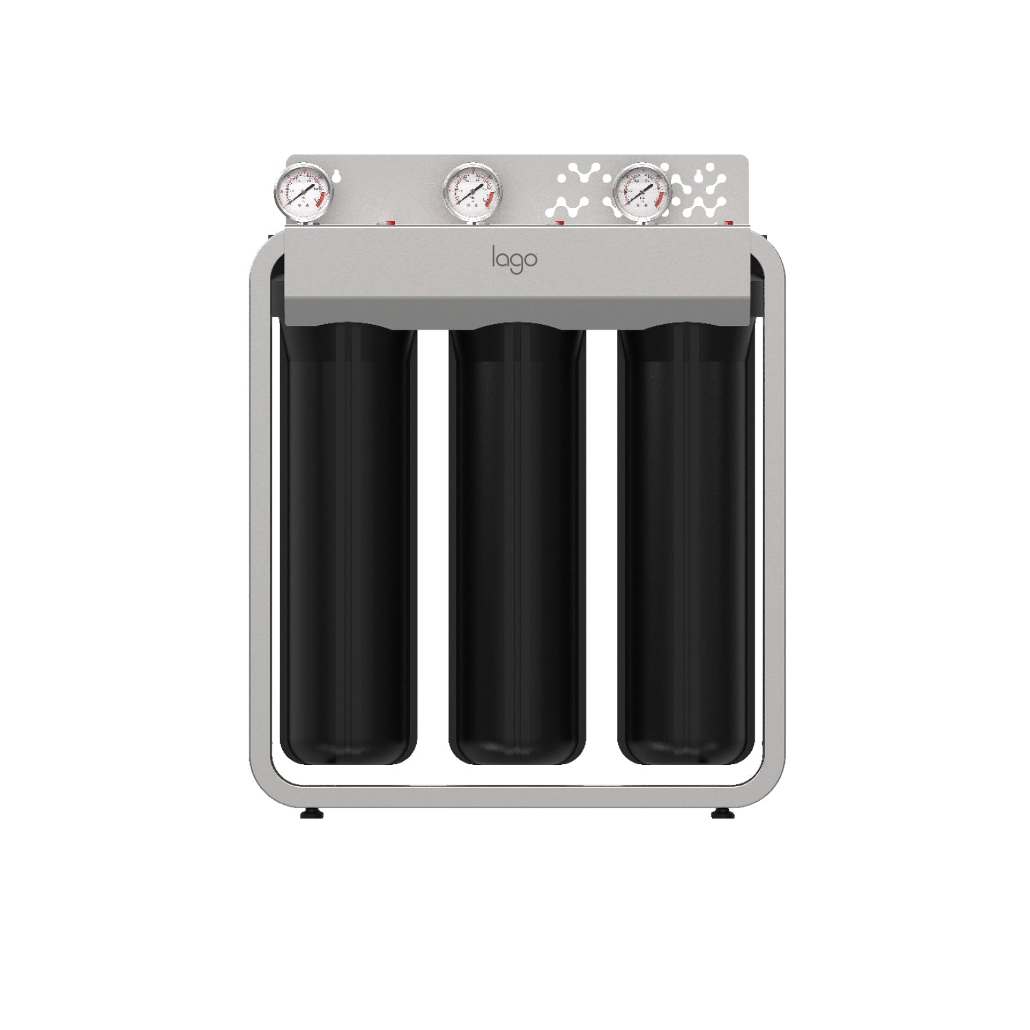 The efficient and reliable Lago 3-Stage Whole House Filtration System - 20" Multi-Purpose provides filtered water for your entire home. Housed in a durable stainless steel frame that can sit on the floor or be wall-mounted, this comprehensive system features a sediment filter, GAC filter, and a CTO filter to eliminate common water problems, including unpleasant odors, tastes, and colors. Plus, this system is installation ready with 1" connections to deliver water throughout your home without pressure loss.