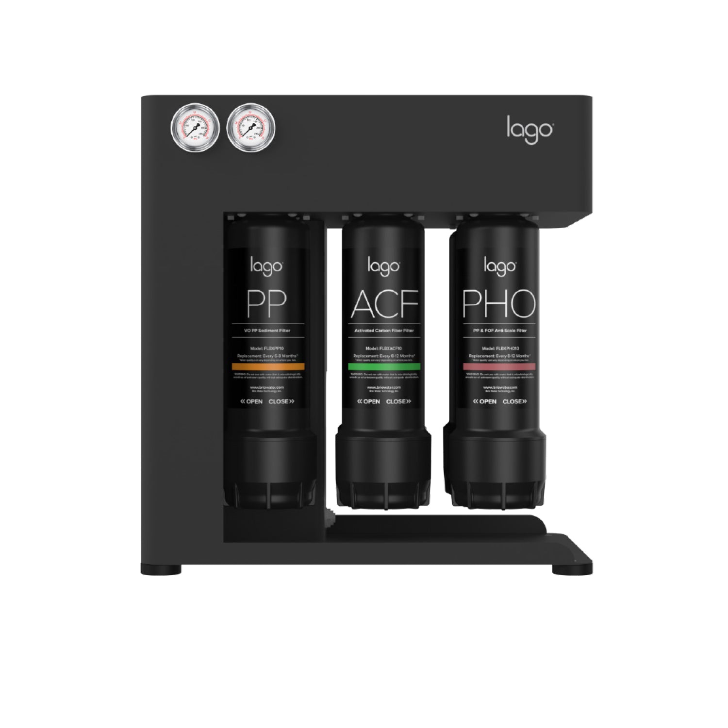 The Lago 500 Undersink Quick Change RO Filtration System features 5-stages of powerful filtration and provides up to 500 contaminant-free gallons of water per day for commercial settings. It has a compact space-saving footprint, an industrial-grade steel frame to withstand everyday use, and easy-to-read gauges for instant water-pressure assessment. Plus, the innovative quick-change filter system enables you to perform required filter maintenance & filters replacements faster, eliminating unnecessary downtime.